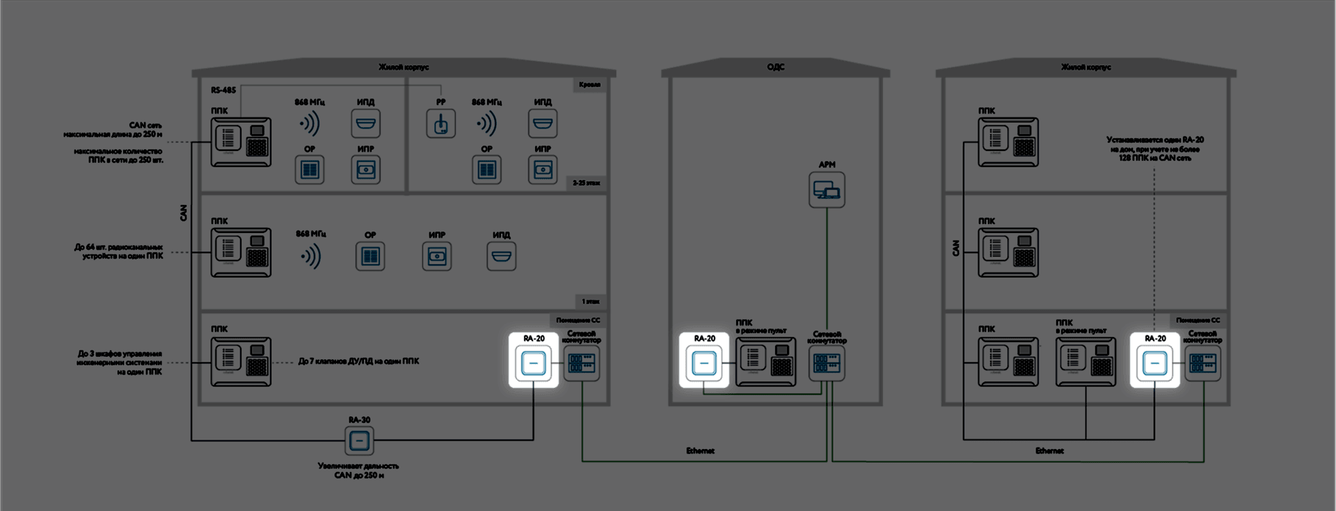 | «PinUp» количество RA-20 в сети VLAN, шт | 250 |